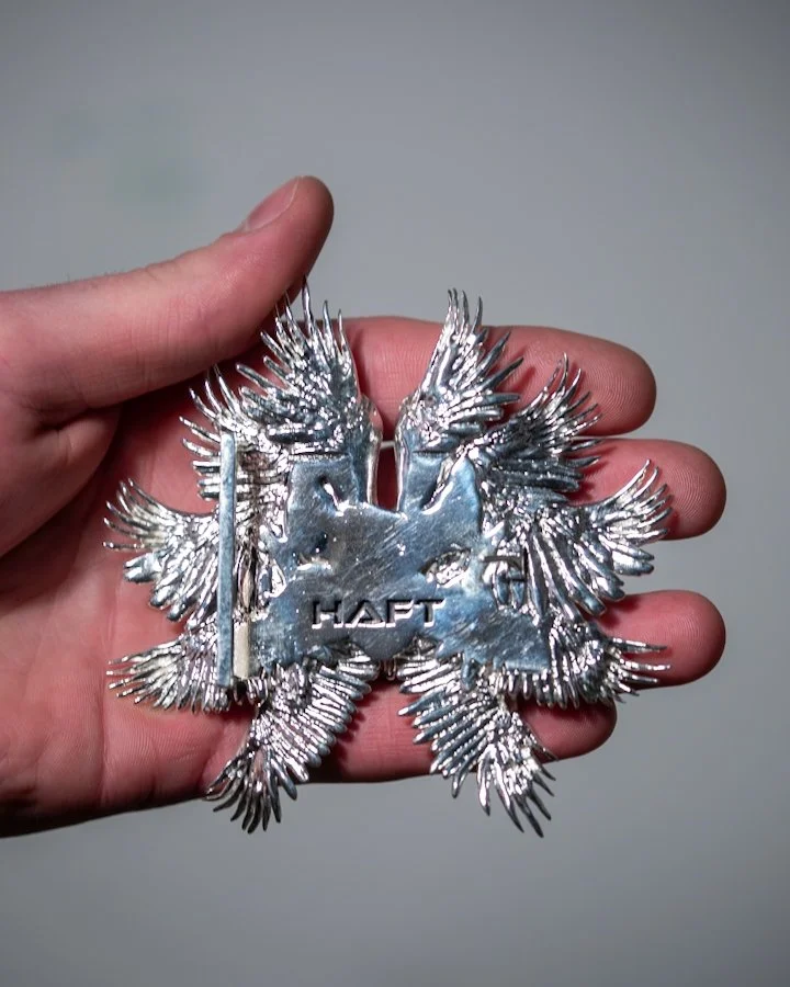 Haft Categories: All Bird of Pray 18k Gold Halo of Haft Ring All Bird of Pray 18k Gold Halo of Haft Ring Bird of Pray Ring, 18k Gold, Edition of 26 $27,500.00 Halo of Haft Ring, 18k Gold, Edition of 51 $20,000.00 Bird of Pray Buckle, Silver Plated Brass, Edition of 5000, First 250 Available Now $0.00 Bird of Pray Buckle, Sterling Silver, Edition of 101, First 5 Available Now $3,750.00 Halo of Haft Ring, Sterling Silver, Edition of 1001 $500.00 Bird of Pray Ring Sterling Silver, Edition of 501, First 50 Available Now $900.00